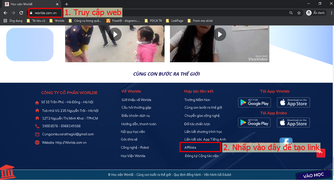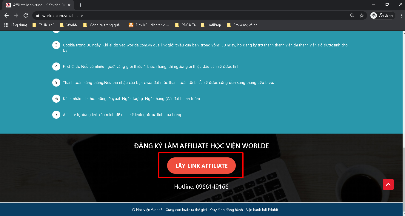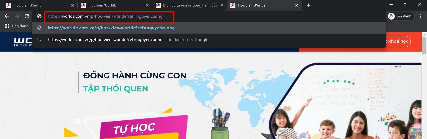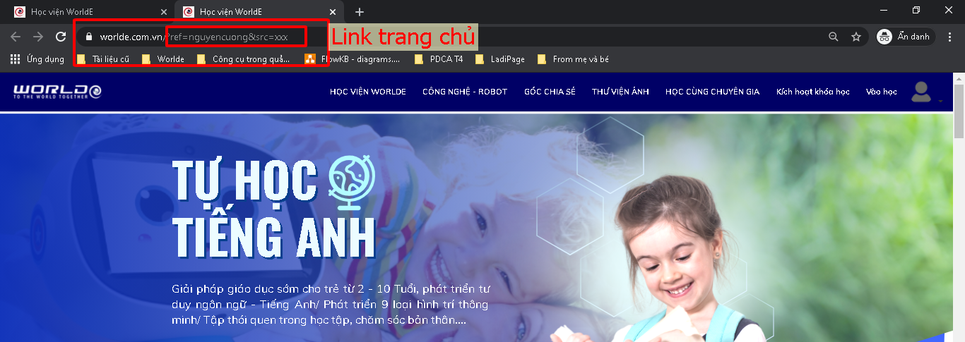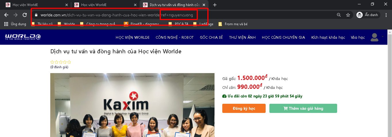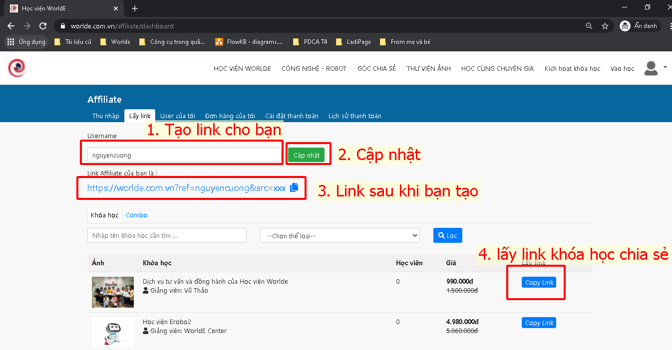 Bước 3: Ghép 2 link lại với nhau để tạo thành 1 link có chứa Affiliate của bạn đi chia sẻ. VD: https://worlde.com.vn/p/hoc-vien-worlde?ref=nguyencuong